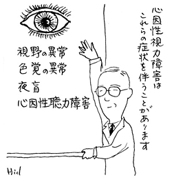 心因性視覚障害は目の心身症のひとつですが、なかでも最も頻度が高いのは視力の低下で、心因性視力障害とよんでいます。心因性視力障害の場合、近視や遠視や乱視があってメガネをかけても、メガネでは視力がでません。検査しても眼球自体には悪い所がない、このような視力障害は、小学生や中学生などの子どもに多くみられます。