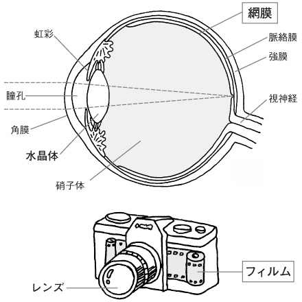 光は目の正面から入ってきて、角膜、前房、水晶体、硝子体を通り抜け、網膜で焦点を結びます。網膜に入った光は、視細胞で電気信号に変換され、網膜につながっている神経線維を伝わり、その神経線維が集まってできた視神経に達し、そこから脳に届きます。