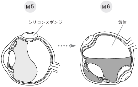 網膜裂孔の状態によっては、硝子体内にきれいな気体を注入して、裂孔部を硝子体側からふさぐことがあります(硝子体ガス注入術ー図6)。注入した気体は自然に吸収されますが、それまでうつ伏せ姿勢などの体位制限が必要となります。