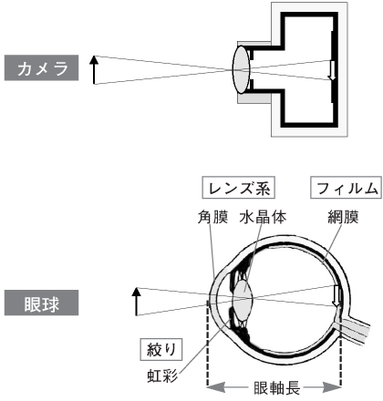 目では、角膜と水晶体はカメラのレンズ系に、目の網膜はカメラのフィルムに、虹彩はカメラの絞りに相当します。また、水晶体の厚さを変えることによって、遠方と近方にすばやくピントを合わせることができ、カメラのオートフォーカスに相当します。しかし、通常、目は細かく動いていて、カメラブレの状態になっていますが、これは、脳で調整されてキチンと見えるようになっています。