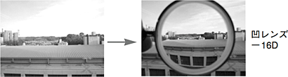 凹レンズ(-10D~-16D)を通してみると、像は小さくなりますが、視野が広く見えますので、前方に何があるかを確認できます。 |