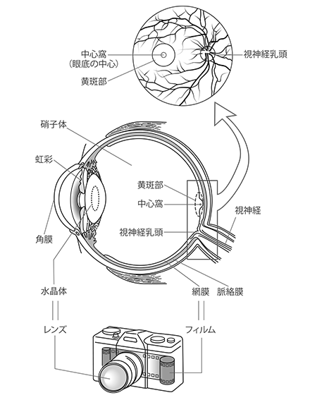 - 眼は、カメラにたとえられますが、眼の内側に網膜という、フィルムにあたる膜があります。網膜には、視細胞といって、ものを見るための細胞がぎっしりならんでいます。網膜の中心部は黄斑部とよばれ、特別な構造になっており、細かいものを識別したり、色を見分ける働きをもった部分で、網膜の中では一番大切な場所です。人が視力1.0を得るには、黄斑部が健全でなければなりません。黄斑部が障害されると、周囲は見えても、細かいものの識別ができなくなります。