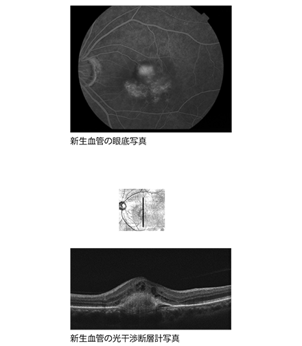 その理由は、滲出型の場合「脈絡膜新生血管」という異常血管が突然発生したり活動化することによります。この新生血管は、とてももろく破れやすく、また漏れやすいため出血や滲出(血液の中の液体の成分が組織にもれること)により網膜の視細胞が障害されます。