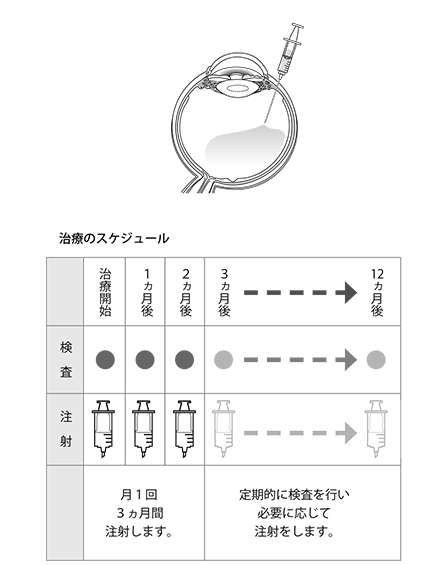 - 加齢黄斑変性の原因となる脈絡膜新生血管は、血管内皮増殖因子(VEGF)というたんぱく質によって成長が促進されます。近年この最も重要な原因物質であるVEGFを抑える薬剤が開発されました。この薬剤は、硝子体内注射といって、眼に直接注射します。外来でできる治療ですが、眼を消毒し、清潔な状態で行い、簡単な手術のような治療になります。注射の前に麻酔をしますので痛みはほとんどありません。治療のスケジュールは病状により異なりますが、一般的には、はじめ3回毎月連続で注射を打ちます。その後は必要に応じて注射をする、あるいは、計画的に投与間隔を決めて注射を行ってゆきます。治療効果の出方には個人差がありますので、長期にわたって注射を継続する必要があることもしばしばあります。中断すると、再発し、治療前の状態にもどることもしばしばあります。根気よく治療を続けましょう。