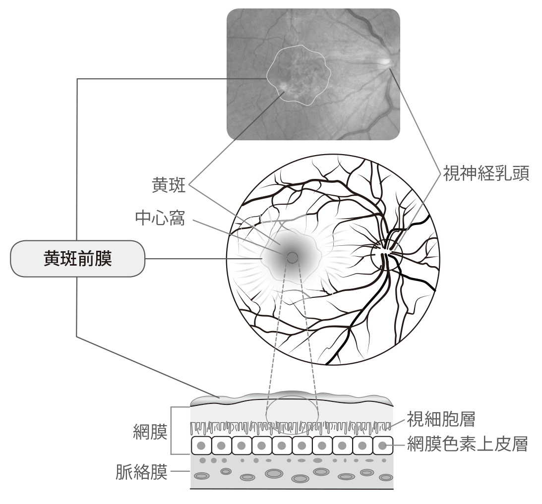 黄斑前膜は、黄斑上膜、セロファン黄斑症、黄斑パッカーとも呼ばれ、網膜の中心である黄斑の前に張る線維状のうすい膜ができる病気です。角膜の病気や水晶体の濁り(白内障)と異なり、眼球の奥底に生じます。