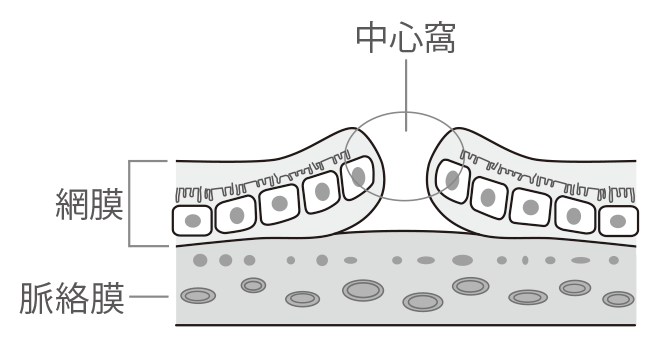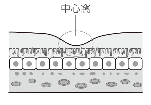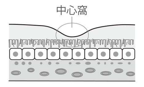 中心窩は視力にもっとも重要な場所です。中心窩の網膜は高い視力を得るために、血管がない特殊な構造をしており、視細胞の一種である錐体(すいたい)細胞が規則正しく密に並んでいます。錐体細胞は、もう一種類の視細胞である杆体細胞(明暗を感知)と異なり、小さなものや色を鋭敏に見分けることができる細胞です。