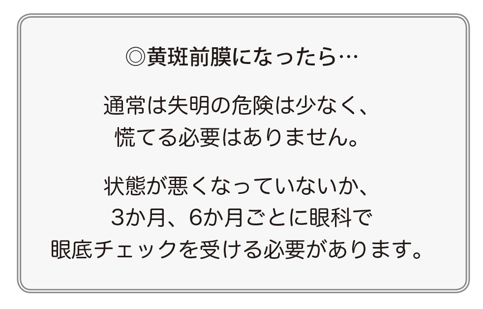 最近テレビなどでよく特集される加齢黄斑変性は、網膜の裏側から新しい弱い血管(新生血管)が生えて起きる別の病気です。加齢黄斑変性では、激しい出血が起きたり、黄斑が萎縮してしまうと失明することもあります。一方、黄斑前膜では新生血管が生えないため、出血や萎縮が起きることは少なく、基本的には失明には至らない比較的良性の病気といえます。しかし、見え方が悪くなることにより、生活に支障をきたすこともあります。