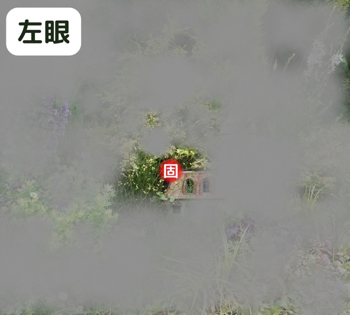 緑内障初期の場合、ほとんどの方が視野欠損を自覚することはありません。下の画像は、緑内障初期の方が、右目と左目で片方ずつ見た時の見え方(視野)の一例です。